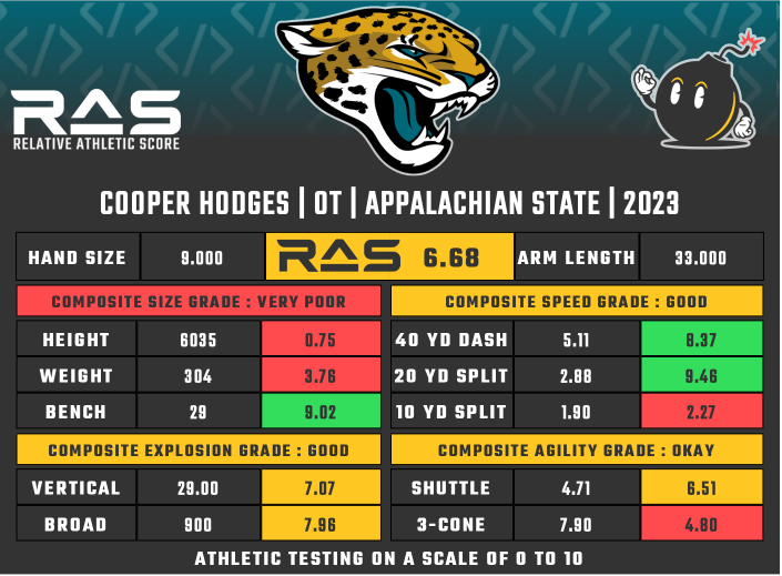 Cooper Hodges was drafted in round 7 with pick 226 in the 2023 draft class. He scored a 6.68 RAS out of a possible 10.00. This ranked 426 out of 1280 OT from 1987 to 2023.