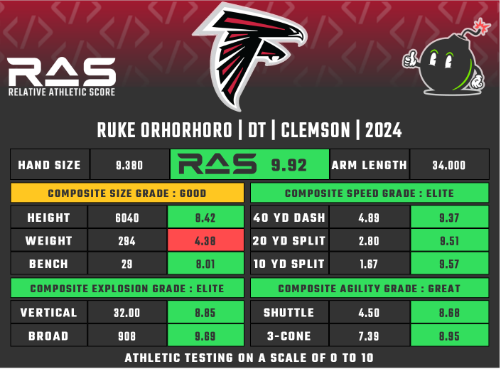 Ruke Orhorhoro was drafted in round 2 with pick 35 in the 2024 draft class. He scored a 9.92 RAS out of a possible 10.00. This ranked 16 out of 1809 DT from 1987 to 2024.