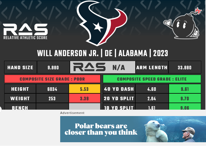 Will Anderson Jr. was drafted in round 1 with pick 3 in the 2023 draft class. He did not qualify for a #RAS due to a lack of measurements.